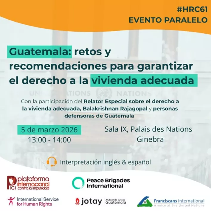 PBI organiseert, in samenwerking met ISHR, PICI, Jotay en Franciscans International een side-evenement genaamd “Uitdagingen en aanbevelingen voor het waarborgen van het recht op adequate huisvesting” (vertolking in het Engels en Spaans beschikbaar) op 5 maart om 14:00 in het Palais des Nations.